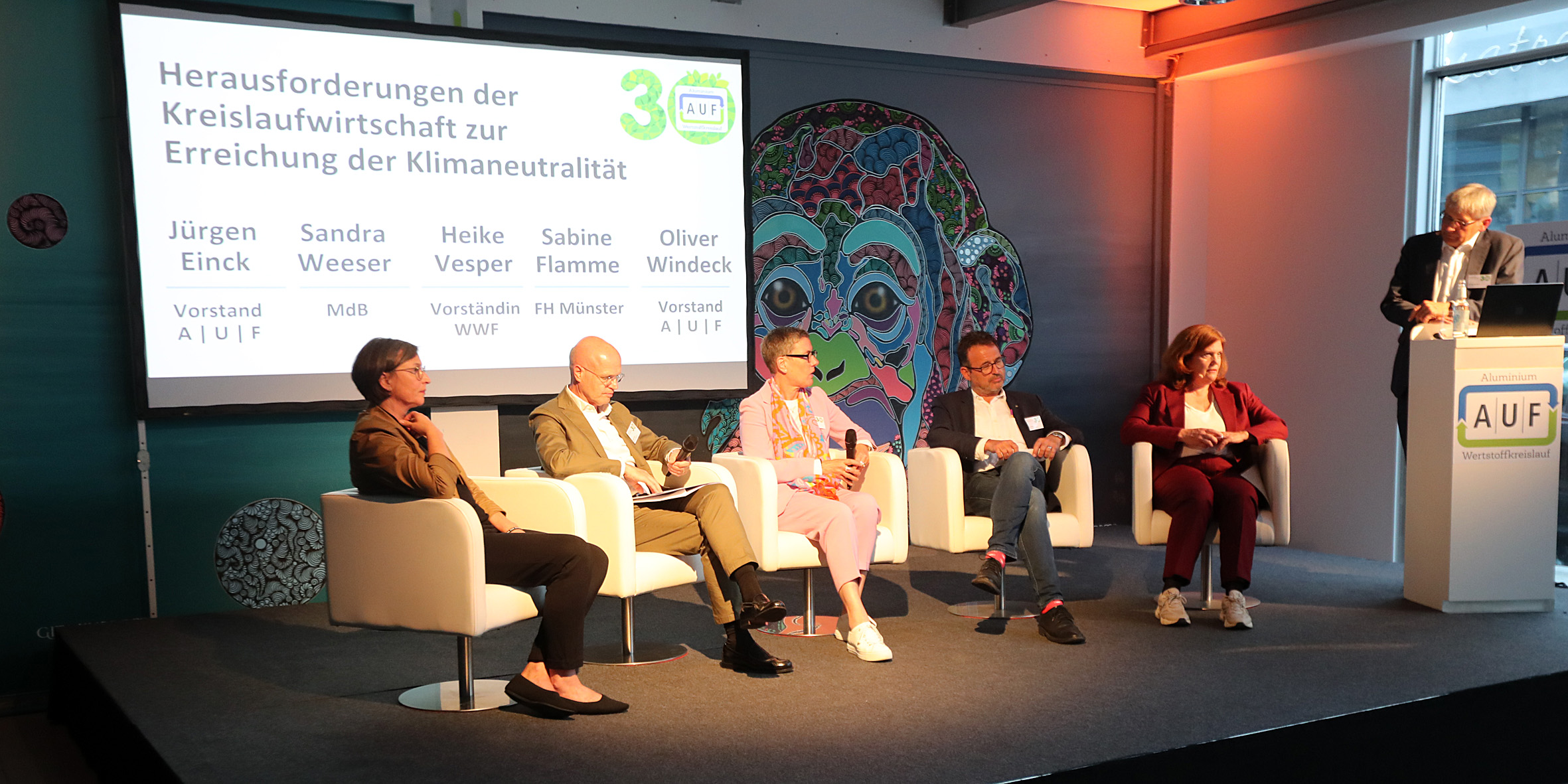 Bild 1: 30 Jahre AIUIF: Debatte zu „Herausforderungen der Kreislaufwirtschaft zur Erreichung der Klimaneutralität“ mit (v.l.n.r.): Heike Vesper (Vorständin WWF), Jürgen Einck (Vorstand AIUIF), Sabine Flamme (FH Münster), Oliver Windeck (Vorstand AIUIF) und Sandra Weeser (MdB); Moderation Thomas Lauritzen (Vorstandsvorsitzender A|U|F) (Foto: Rudolf)
