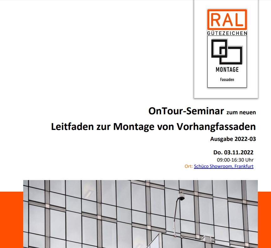 Frankfurt am Main, 6. Oktober 2022. Das zweite diesjährige OnTour-Seminar zum neuen Leitfaden zur Montage von Vorhangfassaden findet am 3. November 2022 im Schüco Showroom in Frankfurt am Main statt. Vom 8. bis 10. November 2022 bietet die Gütegemeinschaft Fenster, Fassaden und Haustüren dann die beiden Herbstseminare für Güteprüfer und Montageverantwortliche bei WERU in Rudersberg an.