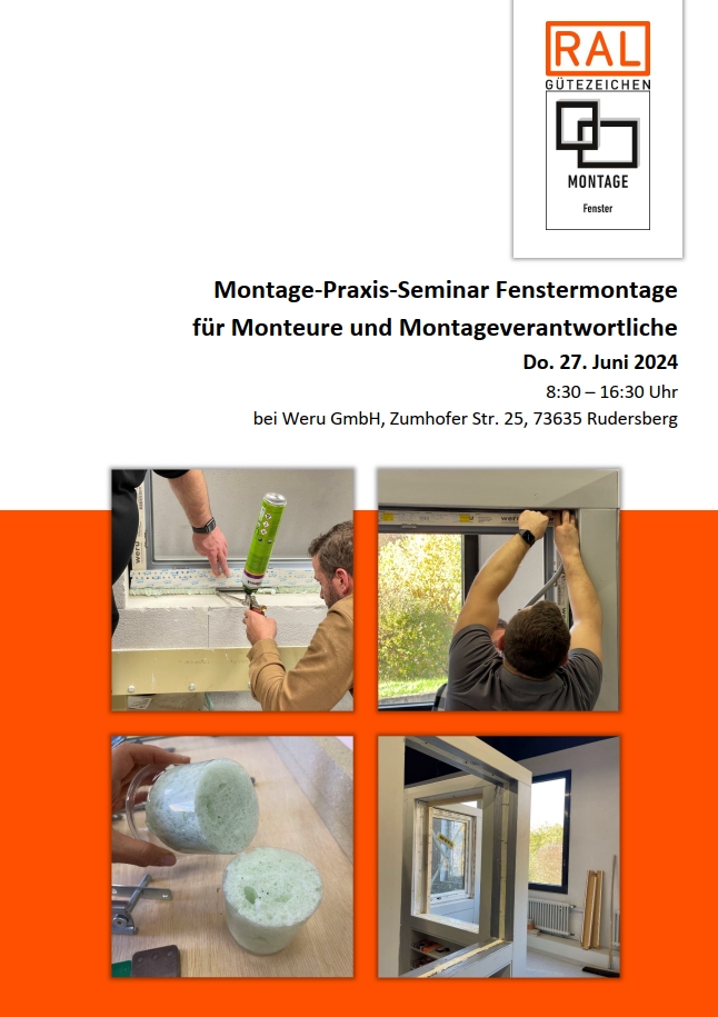 Die Teilnahmegebühren betragen für Gütemitglieder und für Mitglieder der Partnerverbände 395,00 und für Nicht-Mitglieder 495,00 €, jeweils zzgl. ges. MwSt. „Das Seminar ´aus der Praxis für die Praxis` bildet einen zentralen Baustein im alljährlichen Schulungsangebot der Gütesicherung der Montage“, betont Ulrike Döbel von der Gütegemeinschaft. „Arbeitsgrundlage ist die aktualisierte und erweiterte Neuausgabe des Leitfadens zur Montage von Fenstern und Haustüren 2024.“ Fragen zum Seminar beantwortet Ulrike Döbel unter ral@window.de.