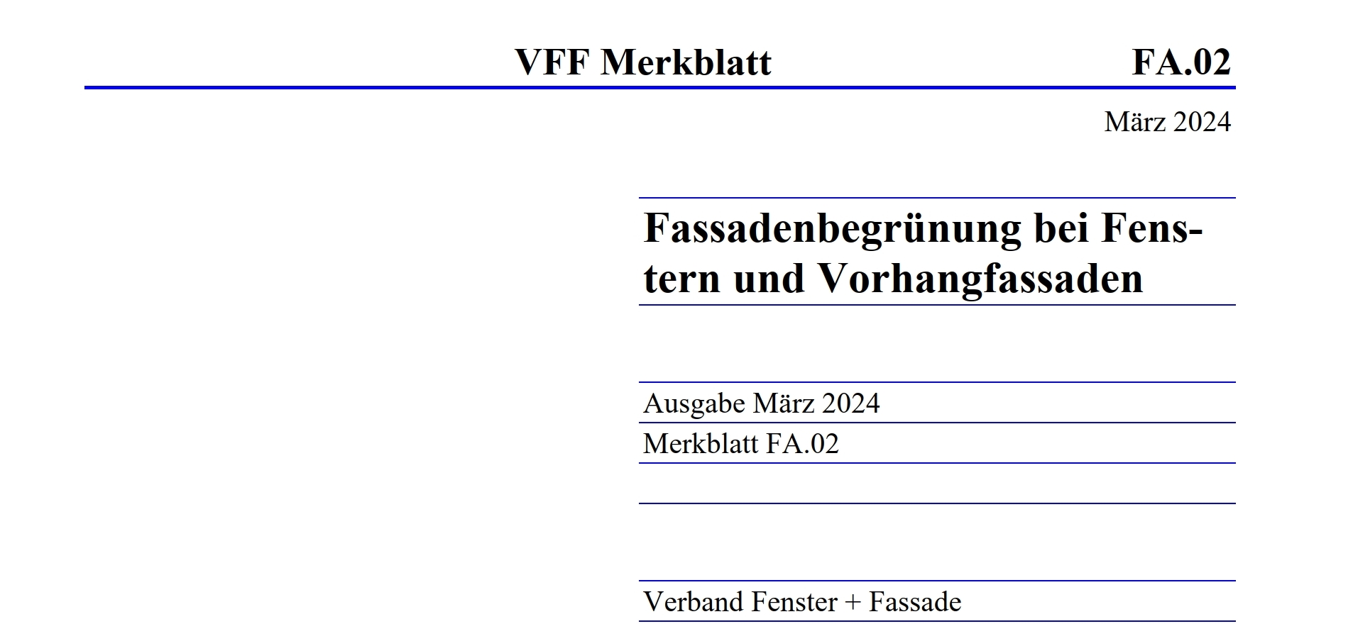 Das VFF-Merkblatt FA.02 umfasst 24 Seiten. Es wurde in der VFF-Arbeitsgruppe Fassadenbegrünung erarbeitet in Zusammenarbeit mit dem Bundesverband Flachglas, Troisdorf, Bundesverband GebäudeGrün e.V. (BuGG), Berlin, dem Fachverband Baustoffe und Bauteile für vorgehängte hinterlüf­tete Fassaden e.V. (FVHF), Berlin, der Forschungsgesellschaft Landschaftsentwicklung Landschaftsbau e.V. (FLL), Bonn, dem Institut für Fenstertechnik (ift), Rosenheim, dem Institut für Oberflächentechnik GmbH, Schwäbisch Gmünd, sowie den Unabhängigen Berater für Fassadentechnik e.V. (UBF), Schwäbisch Gmünd.
