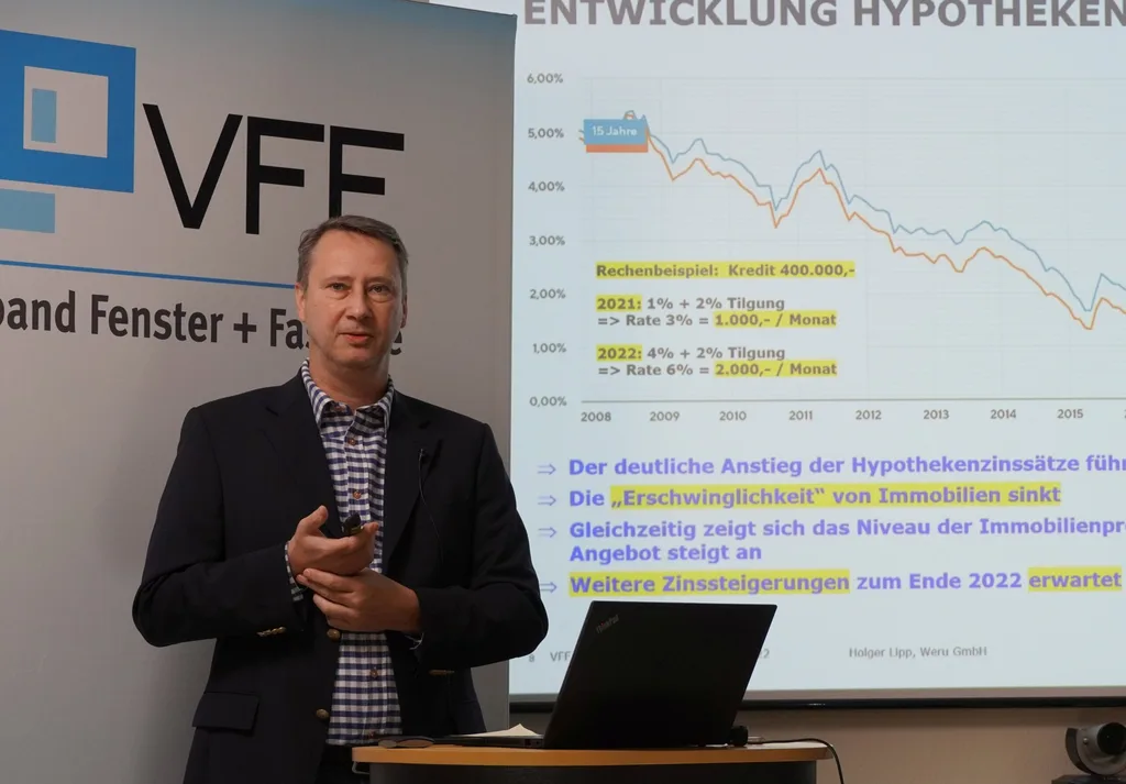 Frankfurt am Main, 26. Oktober 2022. Mit insgesamt rund 100 Teilnehmern fand am 19. Oktober 2022 das Update-Webinar Statistik und Markt 2022-II des Verbandes Fenster + Fassade (VFF) in der VFF-Geschäftsstelle statt. Neben den aktualisierten Konjunkturdaten und der Fenstermarkt-Prognose ging es um den Informationsstand der Endkunden zur Bedeutung und den Chancen energetischer Gebäudesanierung sowie über die gesamtwirtschaftliche Lage, die konjunkturellen Rahmendaten und ihre Auswirkungen auf die Bauindustrie. „Die Prognose für den Fenstermarkt rechnet für 2022 und 2023 jeweils mit einem leichten Rückgang von 1 Prozent“, so VFF-Geschäftsführer Frank Lange. „Die Folgen der Krisen auf Lieferengpässe haben 2022 dazu geführt, dass nicht alle vorhandenen Aufträge umgesetzt wurden. Der somit immer noch hohe Auftragsbestand und die steigende Sanierungsbereitschaft führen dazu, dass sich der Markt trotz deutlicher Rückgänge im Neubau insgesamt halten konnte.“