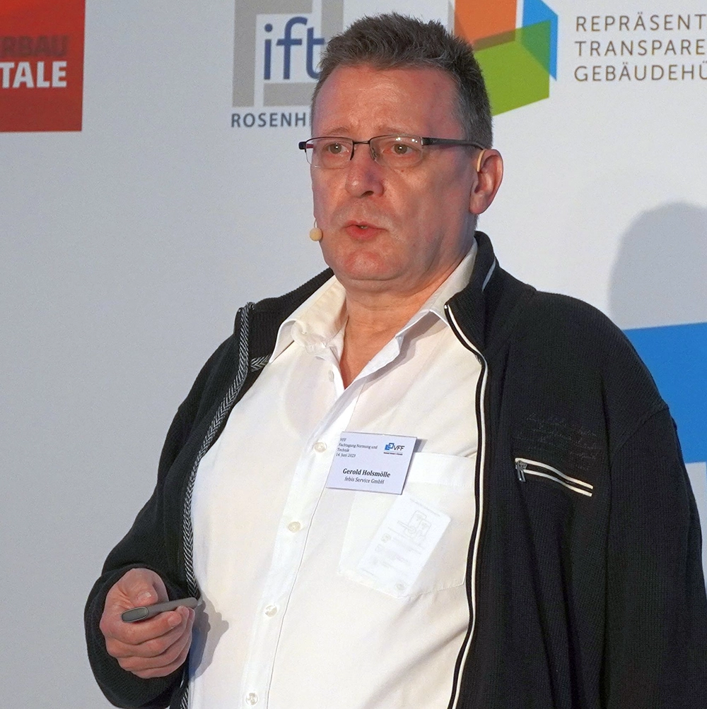 Foto „Sack-FT-N&T_2023“: Norbert Sack vom ift erklärte die praktische Anwendbarkeit der neuen ift Richtlinie mit Typenstatiken für Mehrscheiben Isolierglas in der Sanierung. (Foto: VFF)